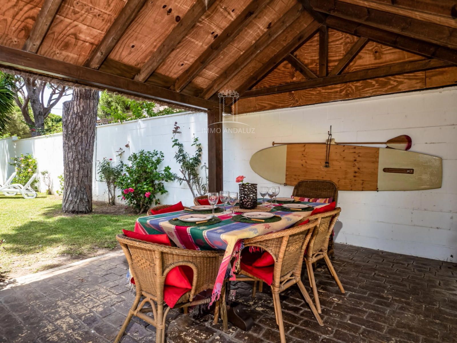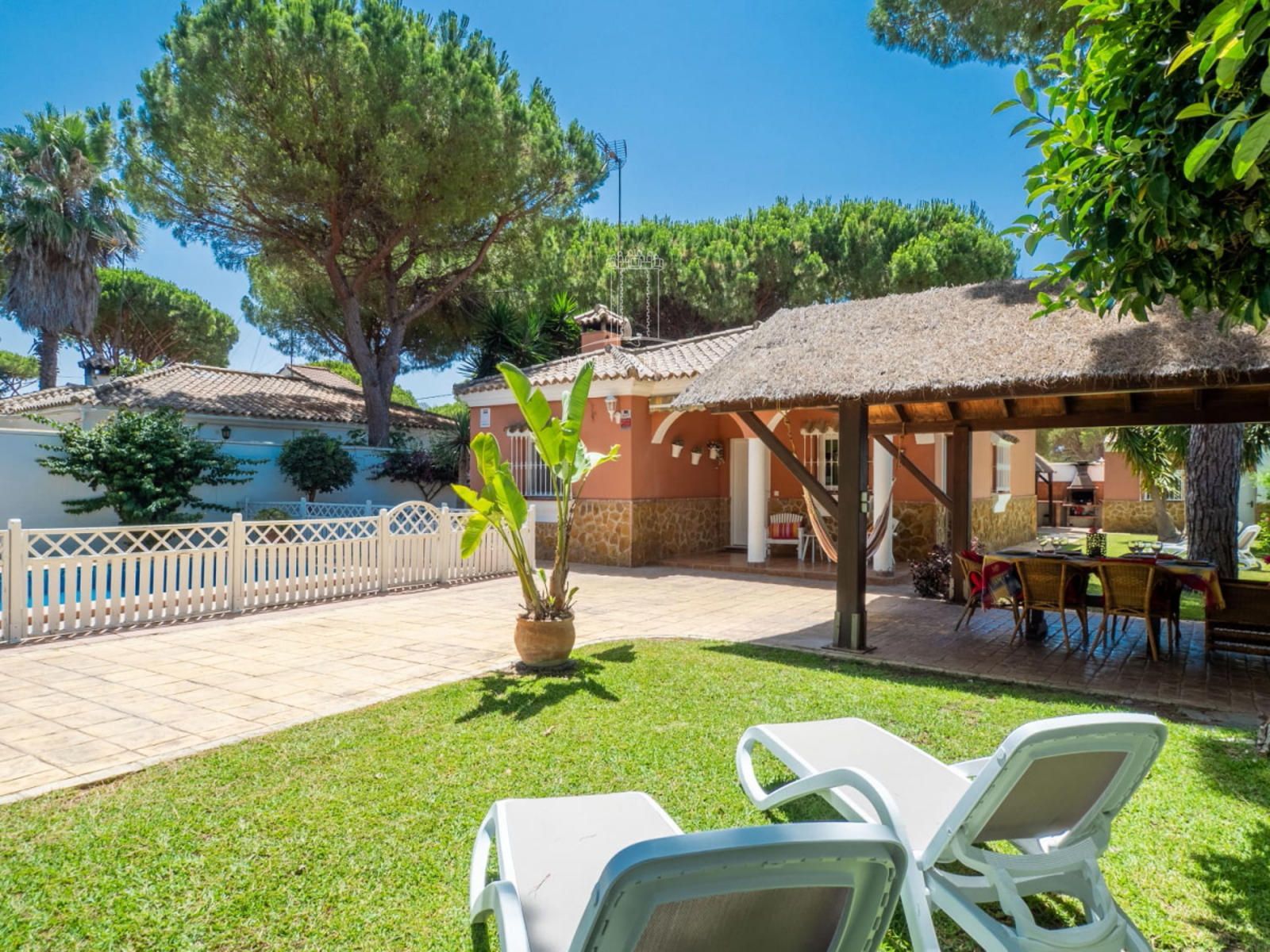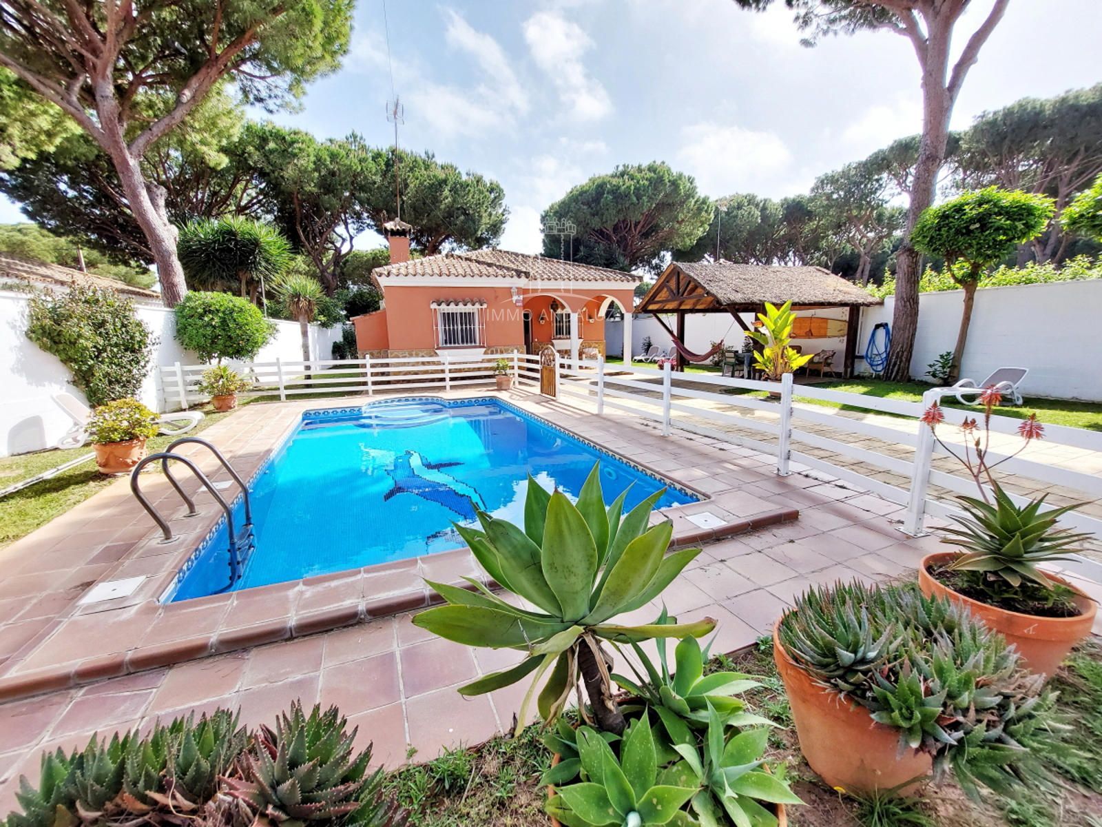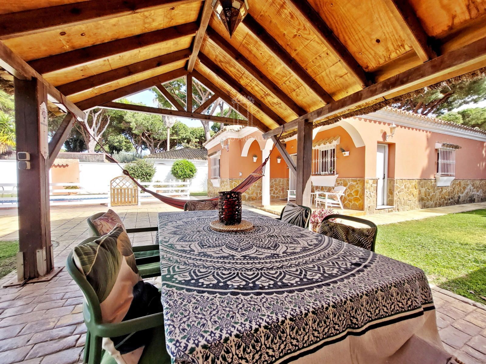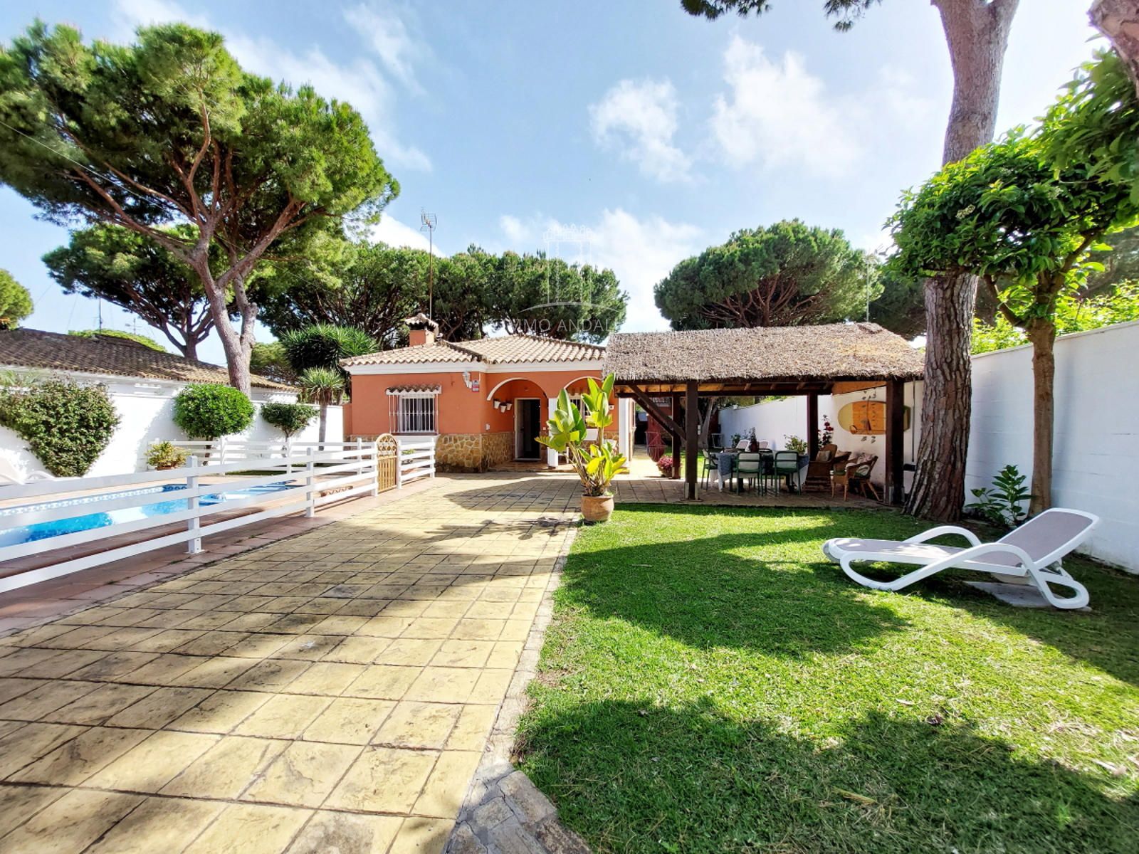 Preciosa villa de 4 dormitorios, 2 baños y piscina privada rodeada de un bonito jardín y con aparcamiento adicional fuera de la carretera, a solo 6 minutos en coche de la playa de La Barrosa.