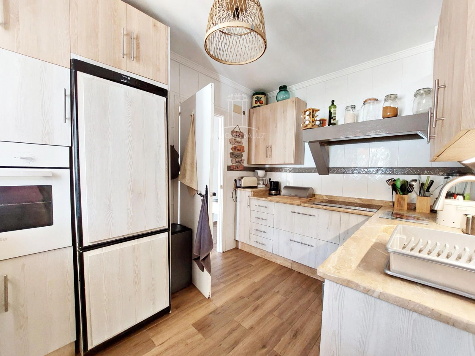 Frente al salón se encuentra la cocina, con muebles empotrados de alta calidad, encimeras de piedra maciza y electrodomésticos integrados, como cocina eléctrica, horno, campana extractora, lavavajillas y frigorífico-congelador. Una puerta conduce al lateral de la propiedad y al jardín.