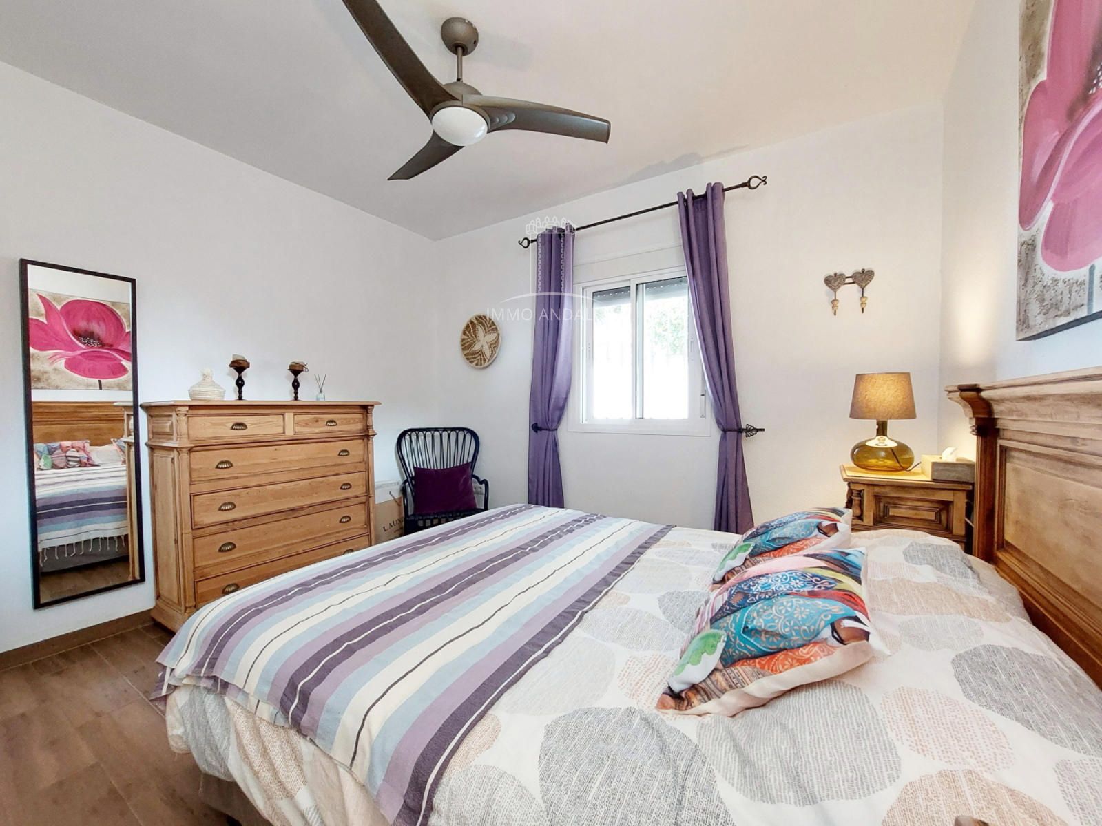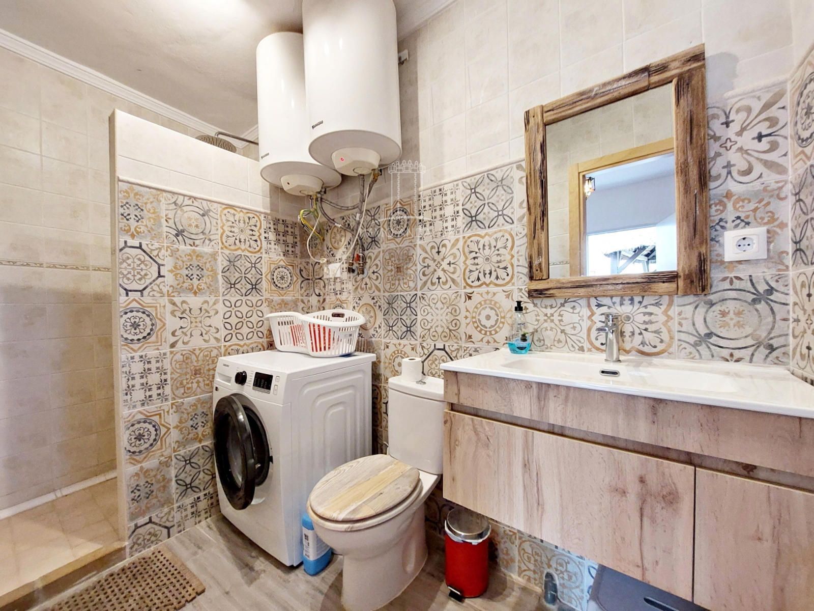 Se accede a la propiedad a través de una puerta corredera electrónica desde la carretera asfaltada. Junto a ella hay también una entrada peatonal. Esta conduce directamente a una gran zona pavimentada con capacidad para aparcar 2 vehículos. A la izquierda se encuentra la piscina privada de 8 x 4 m, que goza de una ubicación soleada y está rodeada por una valla de madera por motivos de seguridad. A la derecha hay una gran terraza cubierta que se utiliza como comedor al aire libre y ofrece vistas al jardín y a la piscina. En la parte trasera de la villa principal, situada en el centro de la parcela completamente vallada, hay otra terraza cubierta y un comedor al aire libre con asientos, una barbacoa empotrada y un fregadero exterior. Junto a la barbacoa se encuentra el apartamento del jardín, con un dormitorio doble y un cuarto de baño recién renovado con ducha, lavabo e inodoro. La lavadora y el calentador de agua también se encuentran en esta zona.